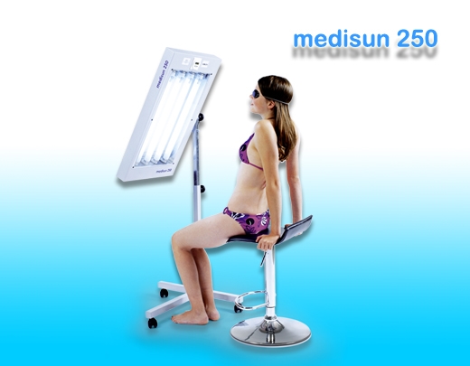 Thiết bị trị liệu vùng cơ thể nhỏ gọn phổ thông Medisun® 250 cho phép lựa chọn phương pháp điều trị phong phú. Thiết bị có thiết kế đứng với hệ thống trục xoay di động 350o có thể xoay 4 hướng giúp việc trị liệu rất thoải mái trong mọi tư thế nằm, đứng hoặc ngồi. Thời gian phơi nhiễm được thiết lập thông qua một bộ đếm thời gian điện tử tích hợp thông qua bảng liều lượng. Vùng phơi nhiễm lớn 60 x 40 cm giúp điều trị dễ dàng các vùng da có thể tiếp xúc tốt, cũng như bàn chân và bàn tay, hoặc thậm chí cả da đầu.